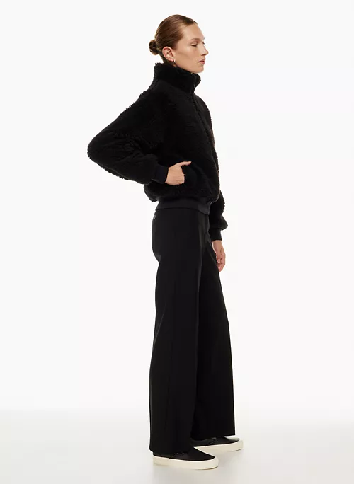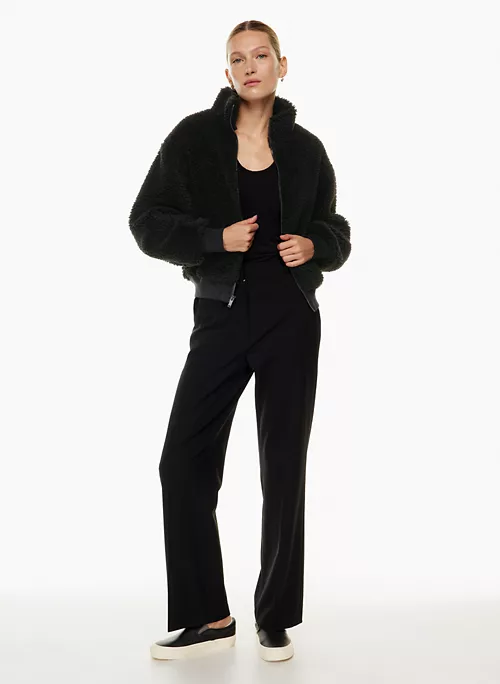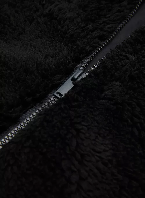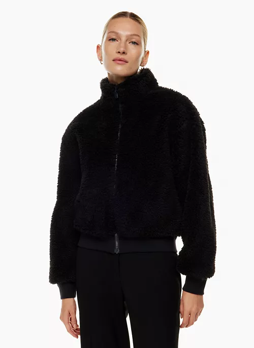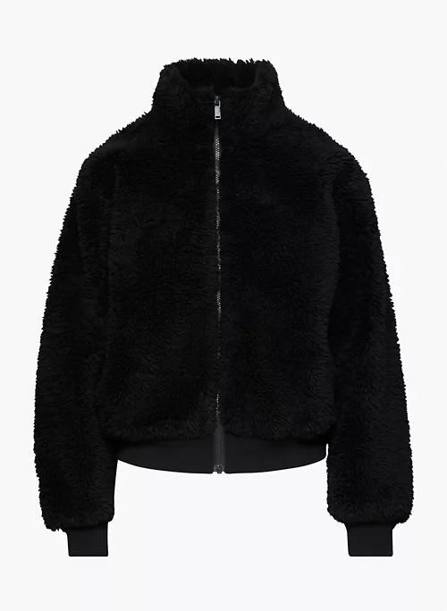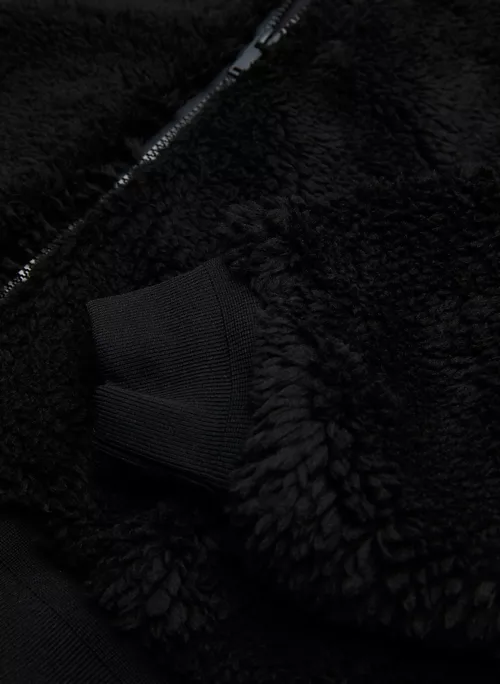 This is a fully-lined bomber jacket with a funnel collar, dropped shoulders and inseam pockets. It’s made with cozy and textural sherpa fleece.
