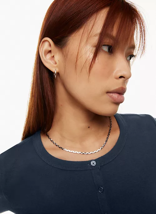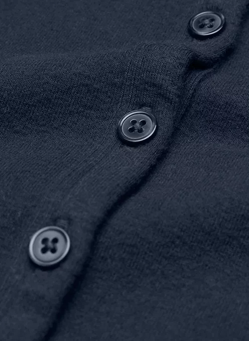 This is a cropped button-up cardigan with a crew neckline. It’s made with Baby Rib — super fine-ribbed fabric that shapes to the body for a cozy, hug-like feel.