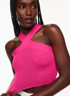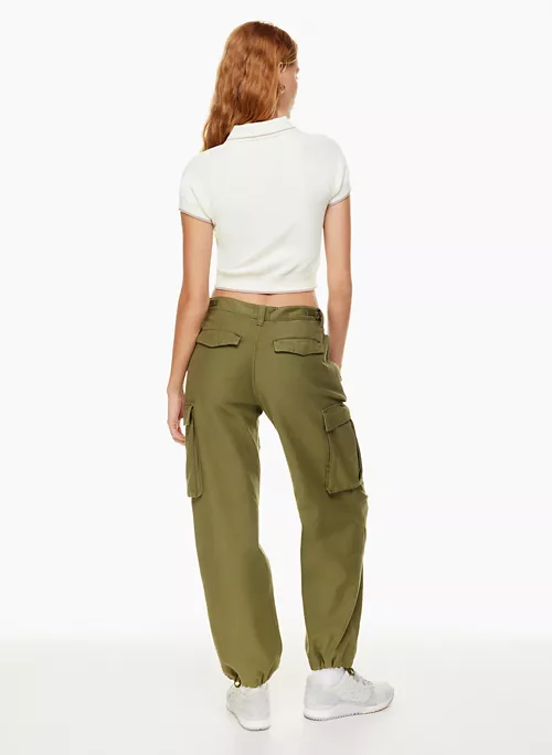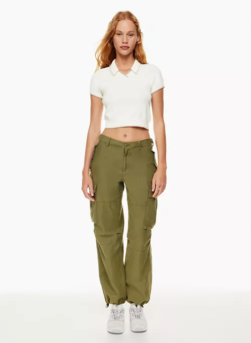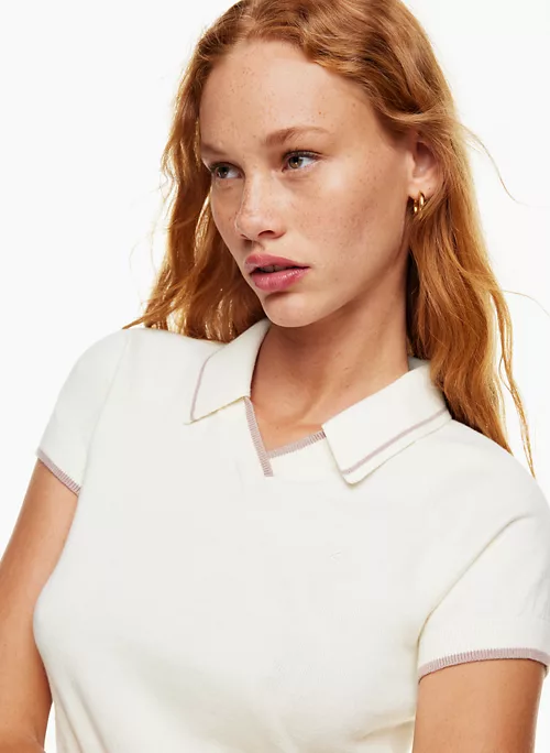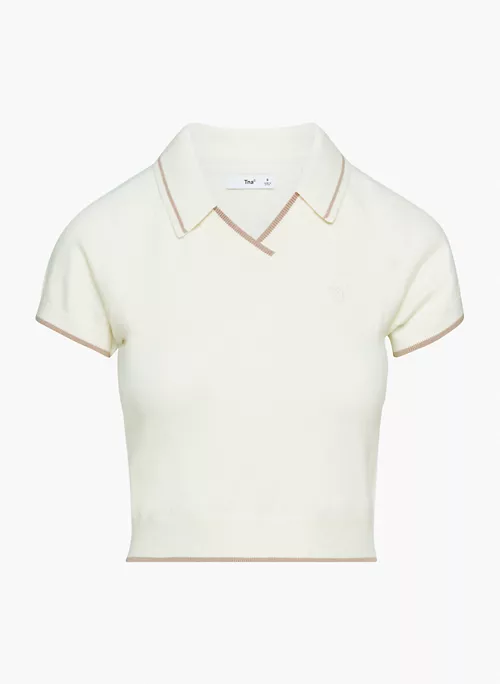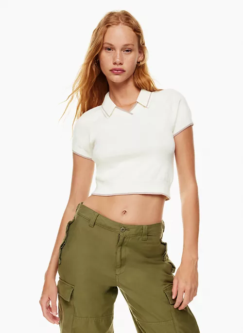 This is a cropped V-neck polo shirt with short raglan sleeves and fully fashioned construction. It’s knit with soft cotton yarn using a Jersey stitch for a soft drape and a smooth, flat feel.