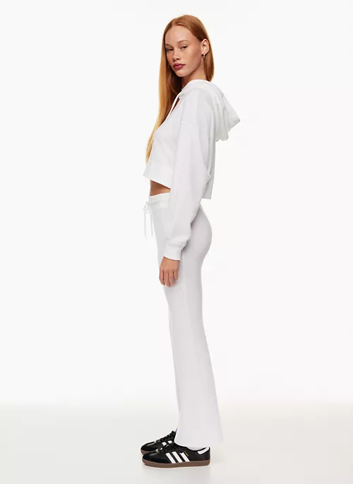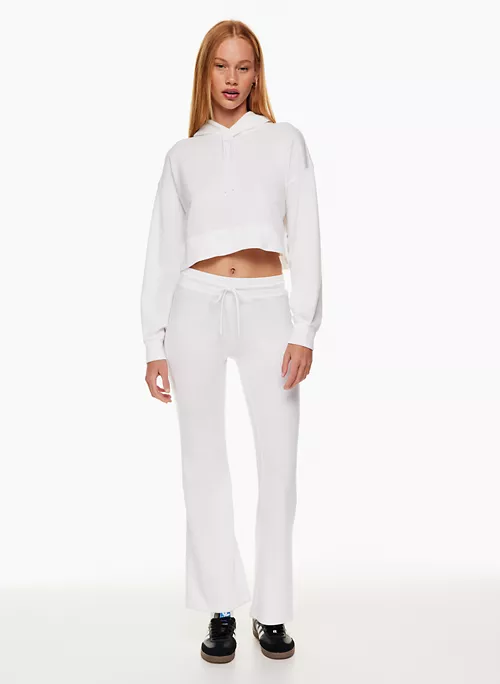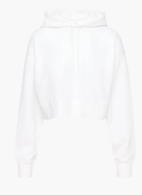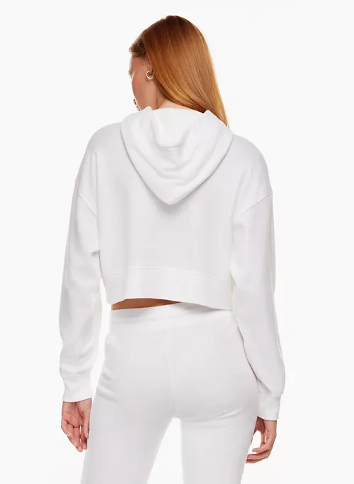 This is a long-sleeve thermal hoodie with dropped shoulders and ribbed trim. It’s made with cozy baby waffle-knit fabric.