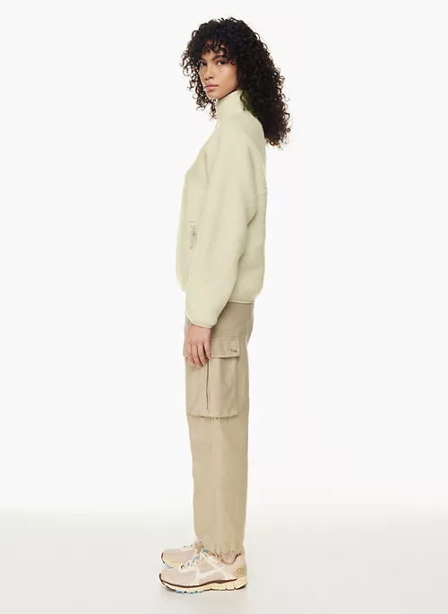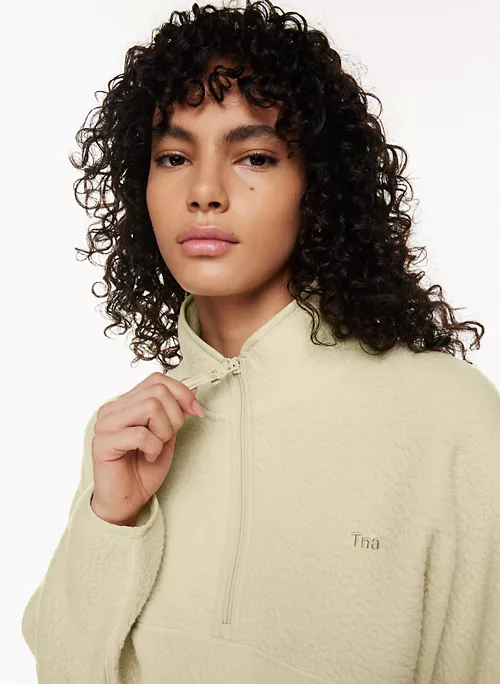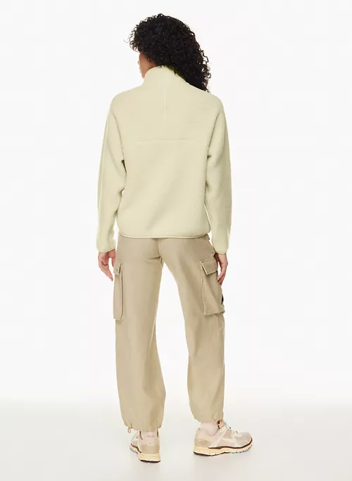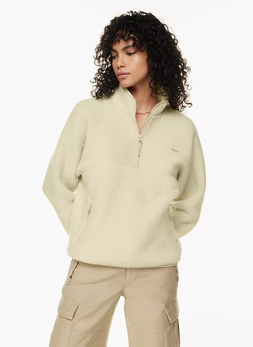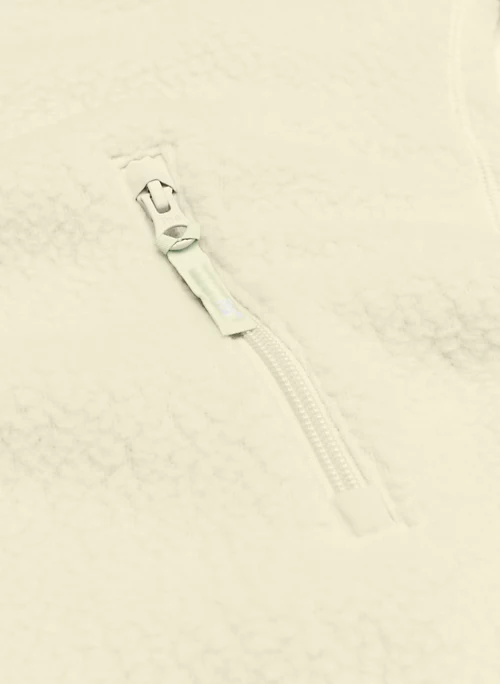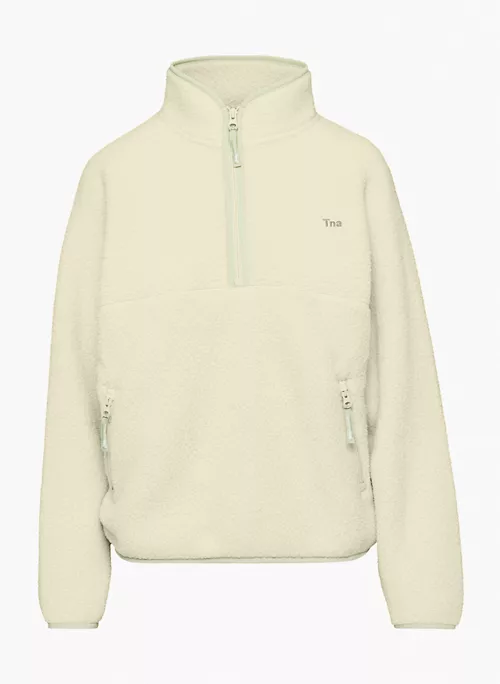 This is a half-zip mock-neck sweatshirt with front hand pockets. It’s made with Bigfoot Polar — lightweight, 100% recycled fleece made with Polartec© Thermal Pro® that’s breathable and warm with a shaggy sherpa texture.Â
