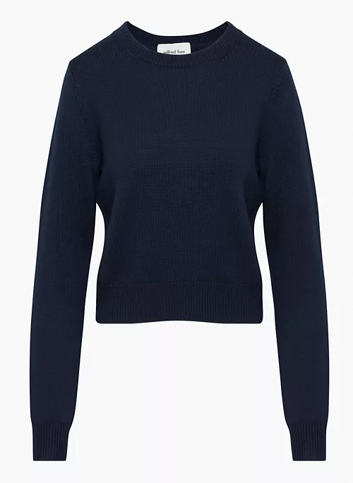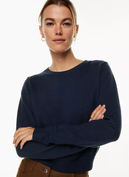 This is a shrunken crew-neck sweater with fully fashioned construction. It’s made with Embrace MerinoTM — extra-fine 100% merino wool yarn coveted for its natural warmth and super soft feel. We source ours from a premium Italian mill. This version is constructed with a Jersey stitch for a soft drape and a smooth, flat feel.
