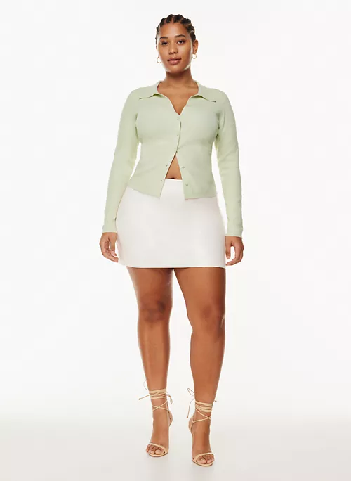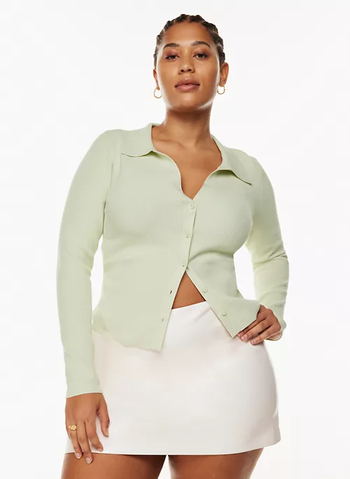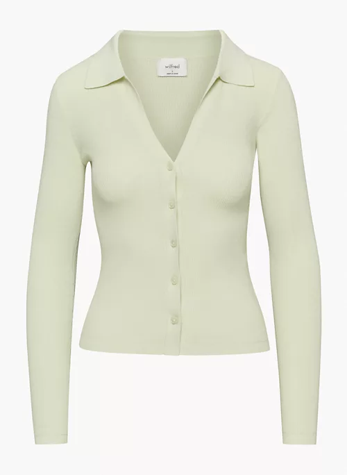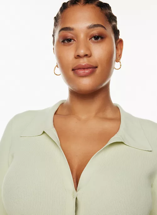 This is a button-up polo sweater with a V neckline and fully fashioned construction. It’s knit with Wonder Yarn — the lightweight yarn that lives up to its name. This peachy-soft yarn offers the all-season warmth of wool, without the wool. It’s made with LENZINGâ„¢ ECOVEROâ„¢ Viscose — responsibly sourced wood-based fibres produced through a process that reduces impact on forests, biodiversity and water supply. This version is constructed using a Half Cardigan stitch with distinct vertical ribs for a three-dimensional look and feel.Â