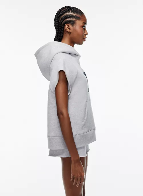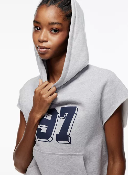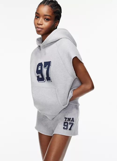 This is a sleeveless, pull-over hoodie with a kanga pocket. It’s made with Tna’s Cozy Fleece — premium, midweight fleece with a soft-brushed back, sueded face and cloud-nine cozy feel. This version features a varsity-inspired graphic that’s designed in-house.Â