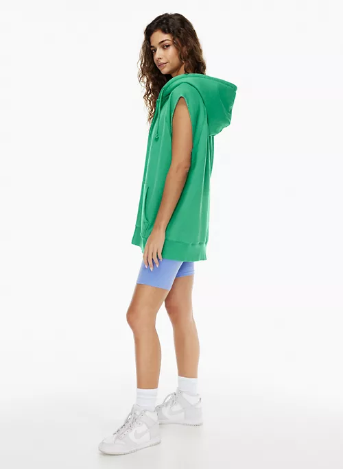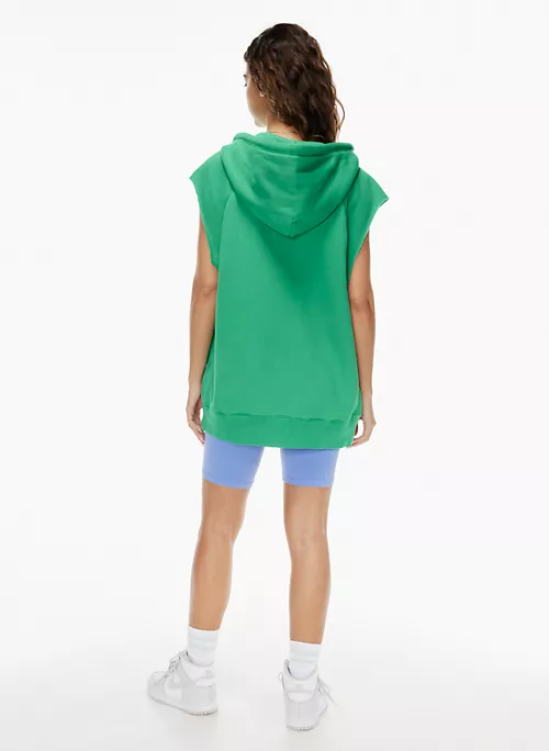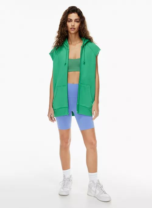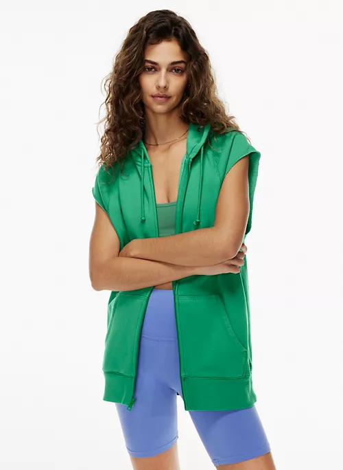 This one’s for you. This is a sleeveless zip-up hoodie with a kanga pocket and raw cut edges at the armholes. It’s made with Tna’s Cozy Fleece — premium, midweight fleece with a soft-brushed back, sueded face and cloud-nine cozy feel.