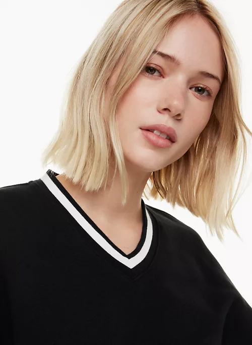 This is a relaxed V-neck sweatshirt with dropped shoulders and ribbed trim. It’s made with Tna’s Cozy Fleece — premium, midweight fleece famous for its soft-brushed back, sueded face and cloud-nine cozy feel. The world’s best.