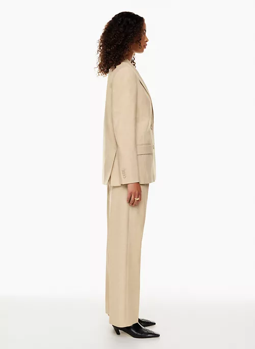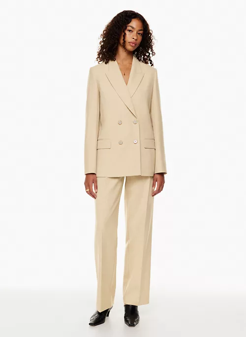 See attached. This is a double-breasted blazer with a peaked lapel, welt pockets and shoulder pads. It’s made with (Re)ssential — softly structured stretch fabric that holds its form while you move easy. It’s sourced from a premier Portuguese mill and made with recycled materials and LENZING™ ECOVERO™ Viscose — responsibly sourced, wood-based fibres produced through a process that reduces impact on forests, biodiversity and water supply.