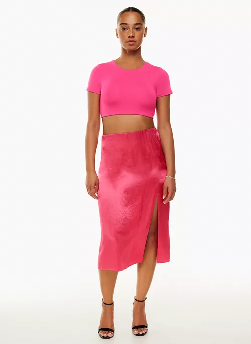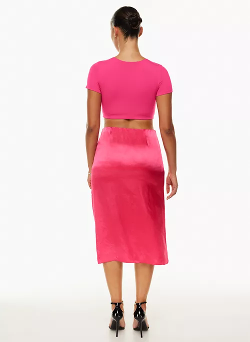 This is a high-rise midi slip skirt with a thigh slit and darted back waist. It’s cut from glossy Japanese satin made with wood-based fibres from responsibly managed forests.