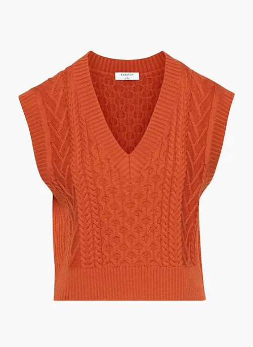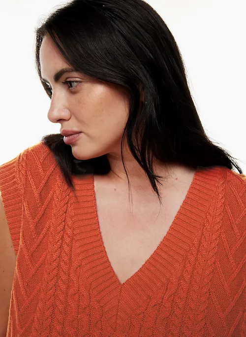 This is a fully fashioned V-neck sweater vest with ribbed trim. It’s knit with Embrace MerinoTM — extra fine 100% merino wool yarn coveted for its natural warmth and super soft feel. We source ours from a premium Italian mill. It’s constructed using a Cable stitch in a unique, custom design for a chunky, three-dimensional look and texture.Â