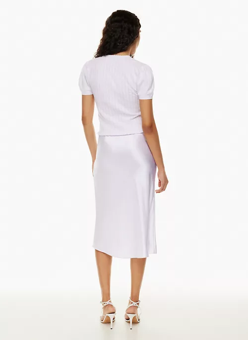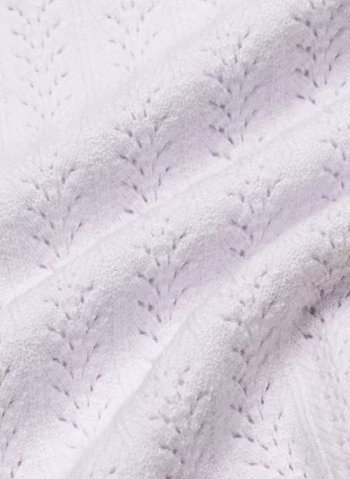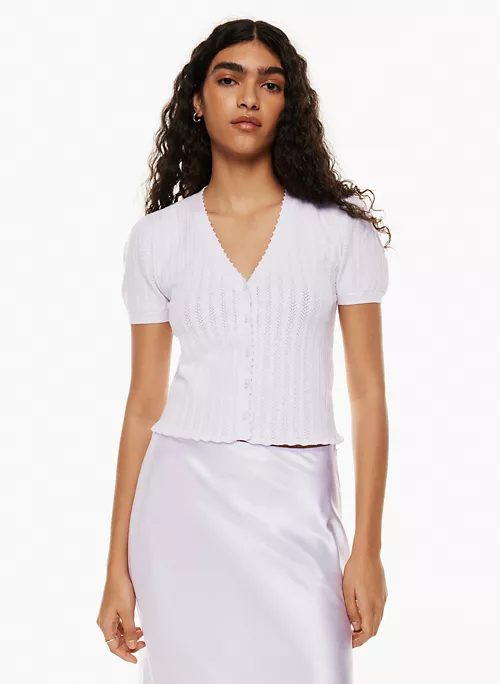 This is a fully fashioned V-neck cardigan with short sleeves. It’s knit with Wonder Yarn — the lightweight yarn that lives up to its name. This peachy-soft yarn offers the all-season warmth of wool, without the wool. It’s made with LENZINGâ„¢ ECOVEROâ„¢ Viscose — responsibly sourced wood-based fibres produced through a process that reduces impact on forests, biodiversity and water supply. This version is constructed with a Pointelle stitch for a delicate look and airy feel.