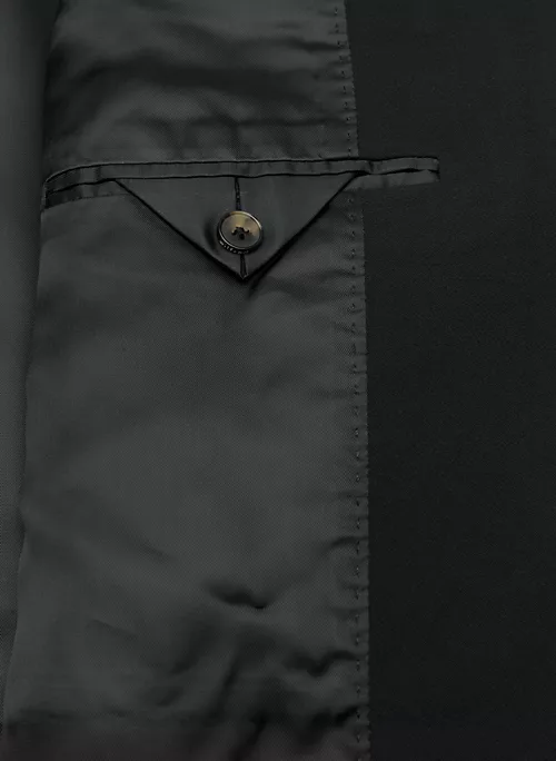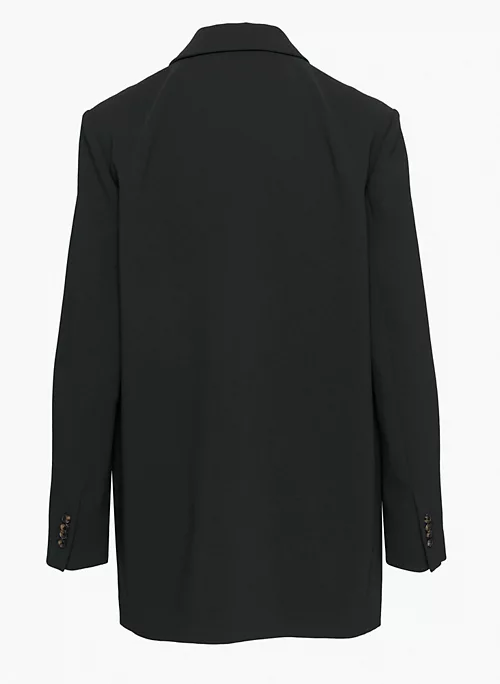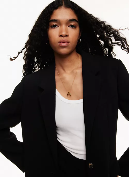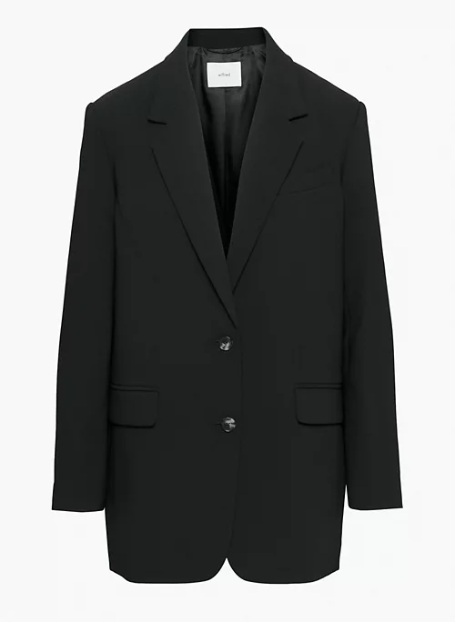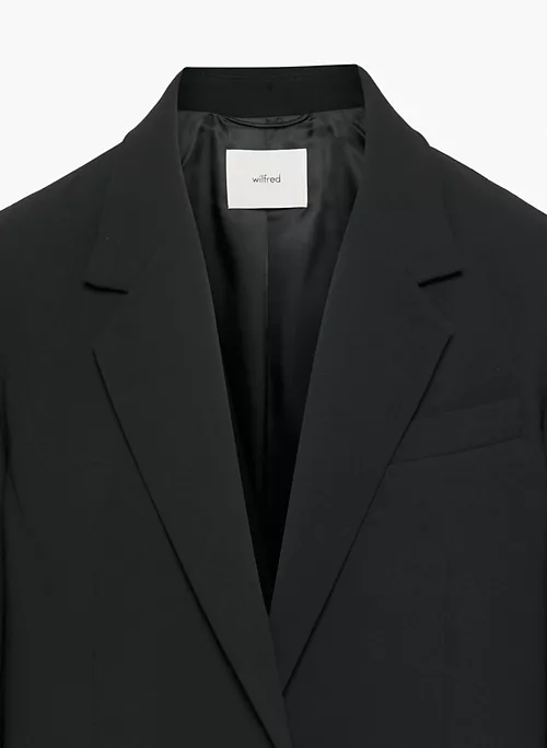 This is an oversized single-breasted blazer with shoulder pads and a notched lapel. It’s made from Crepette — Wilfred’s iconic crepe fabric famous for its subtle texture and breezy, effortless drape. It’s sourced from a premier Japanese mill.