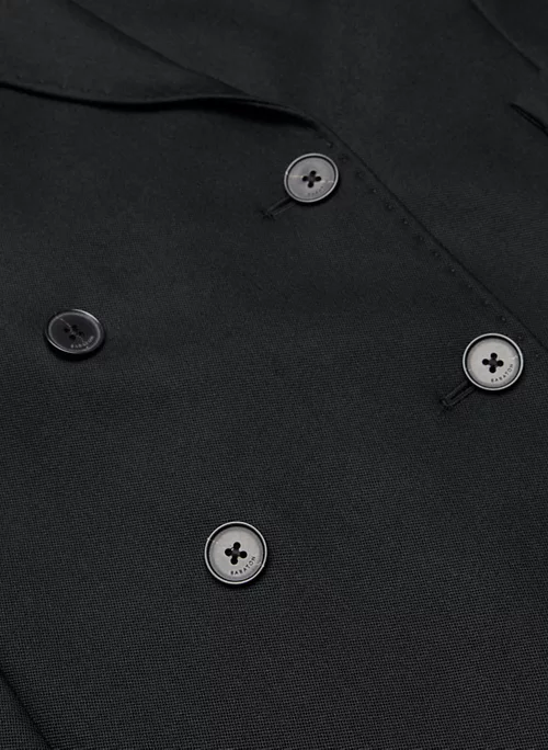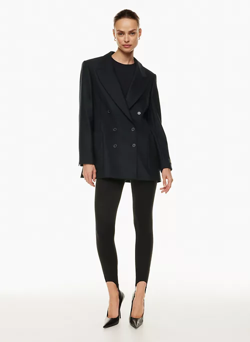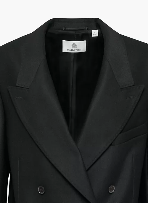 This is a oversized double-breasted blazer with a peaked lapel, shoulder pads and patch hand pockets. It’s tailored with soft, drapey 100% wool twill.
