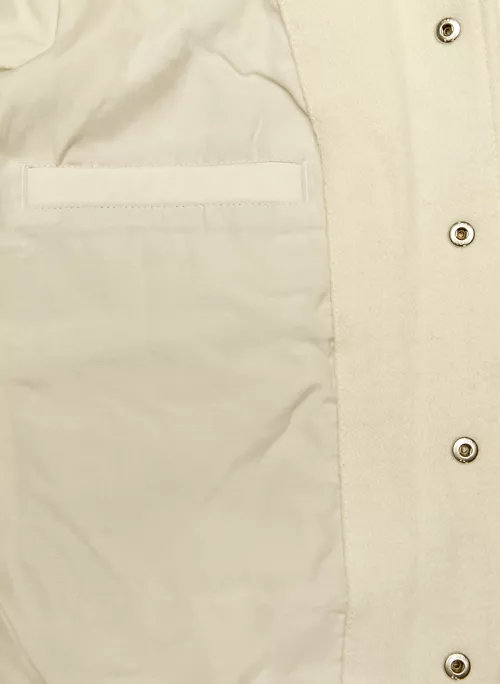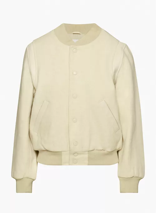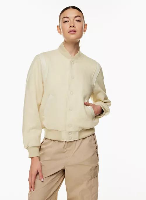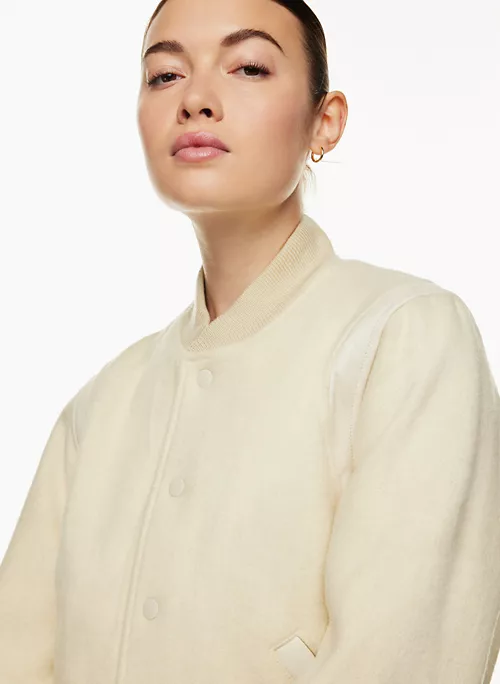This is an insulated varsity jacket with genuine leather trim, dropped shoulders and a snap closure. The body and sleeves are insulated with vegan fill for lightweight warmth without the bulk. It’s made with warm, felted wool that’s dense and textural.