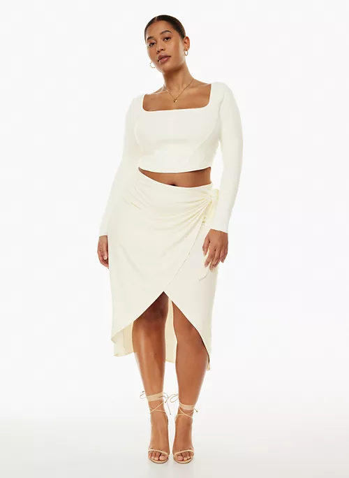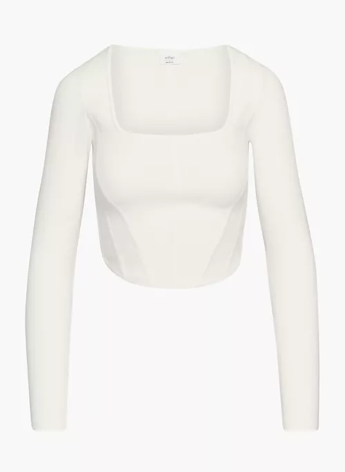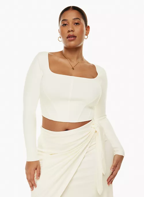 This is a bustier sweater with a square neckline and fully fashioned construction. It’s made with Wonder Yarn — the lightweight yarn that lives up to its name. This peachy-soft yarn offers the all-season warmth of wool, without the wool. It’s made with LENZING™ ECOVERO™ Viscose — responsibly sourced wood-based fibres produced through a process that reduces impact on forests, biodiversity and water supply. This version is constructed using a Half Milano stich for structure and a flat, dense feel.