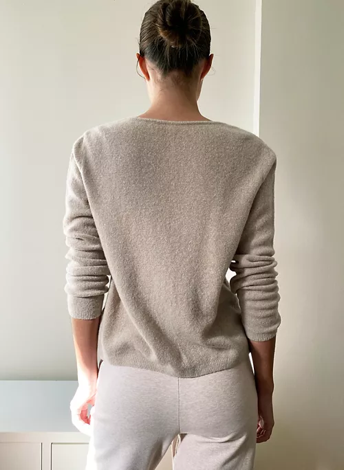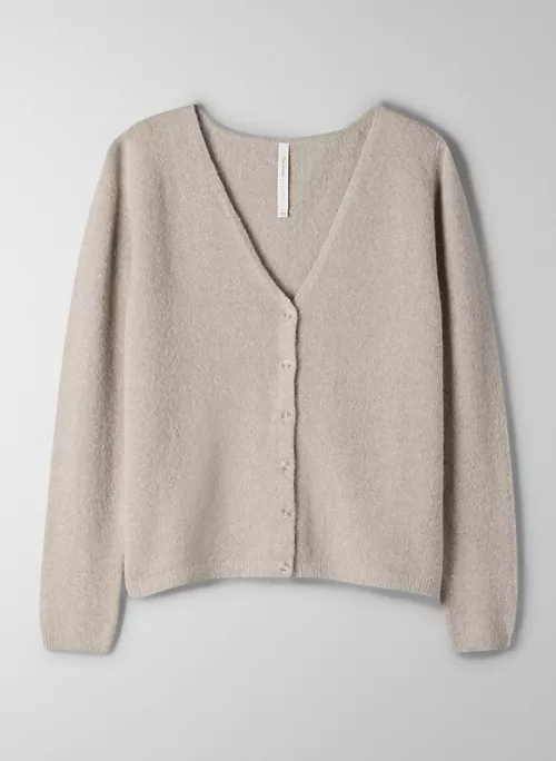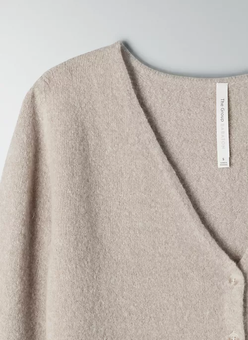 This is a long, open-front cardigan sweater with slit pockets. It’s made from a cozy merino wool blend fabric from Italy.Â