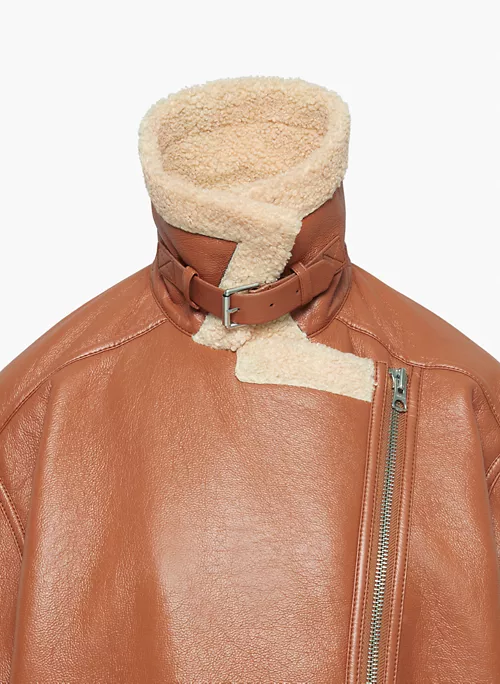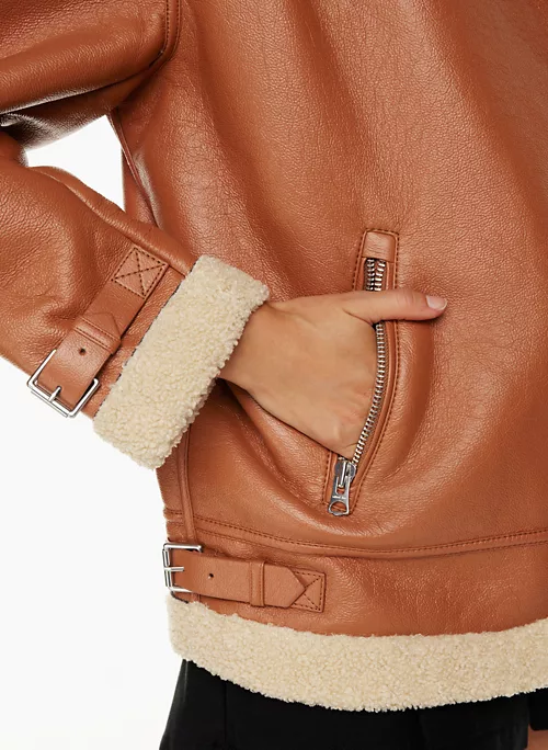 This is a moto jacket with zippered pockets and buckle tabs at the hem and cuffs. It’s cut from our innovative Vegan Leather that looks and feels like the real thing. The interior is lined with plush Vegan Shearling.