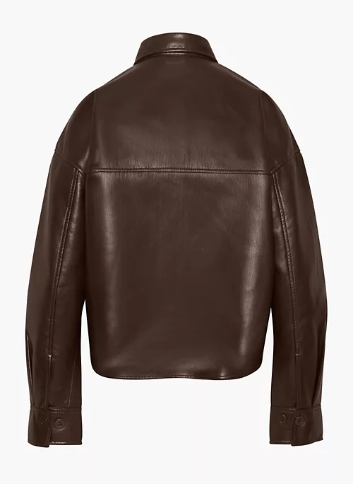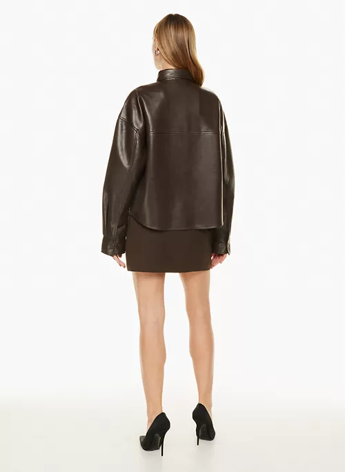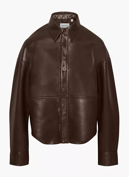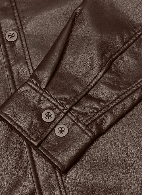 This is a collared button-up shirt jacket with dropped shoulders and a rounded hem. It’s made with our innovative Vegan Leather that looks and feels like the real thing.Â