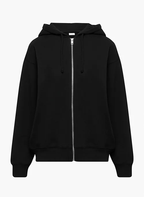 This is a zip-up hoodie with a kanga pocket, inseam pockets and dropped shoulders. It’s made from 100% organic cotton French terry fleece.Â
