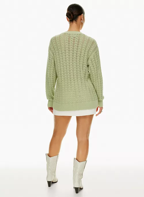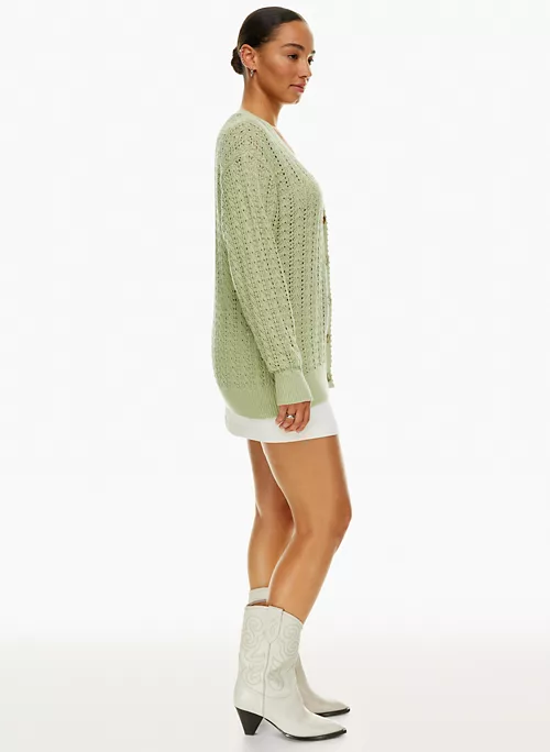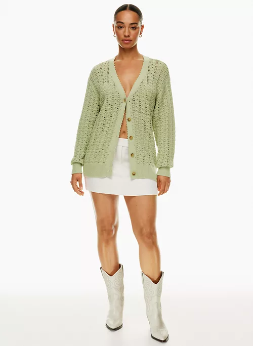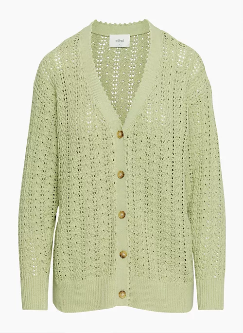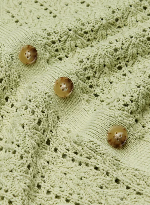 This is a fully fashioned V-neck cardigan with dropped shoulders. It’s knit from soft, midweight cotton yarn. It’s constructed using a Crochet stitch with a looped knit pattern for a textural look and airy feel.