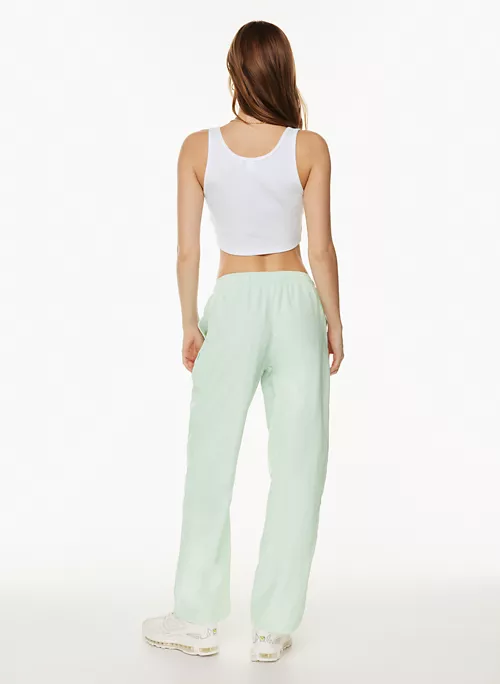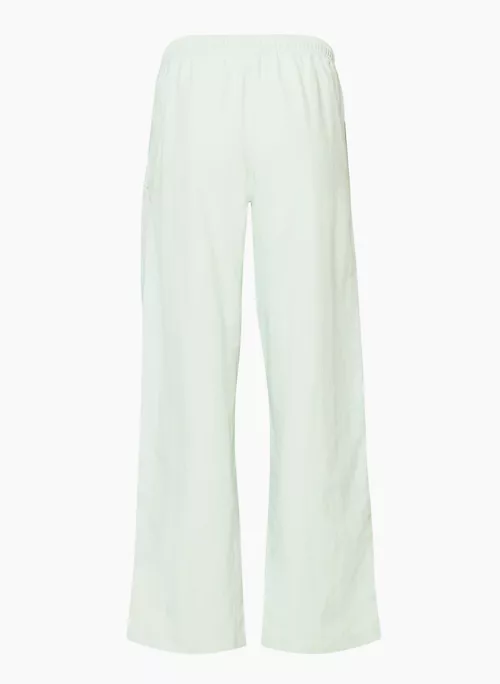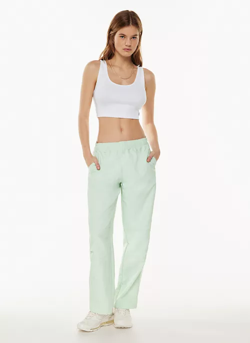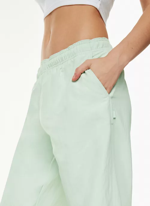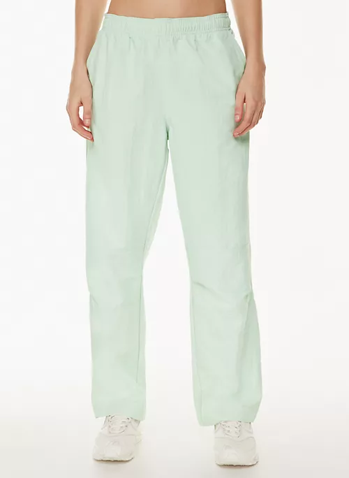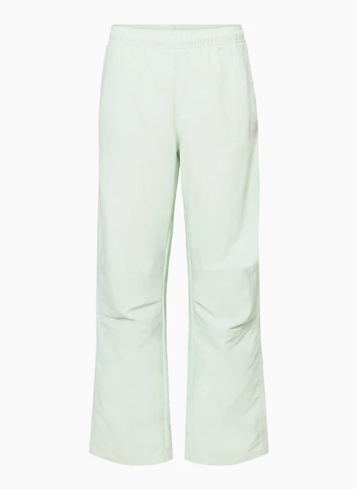 These are mid-rise track pants with an elastic waist, hand pockets and a drawcord. They’re made with lightweight, water-repellent nylon that’s made from 100% recycled materials.