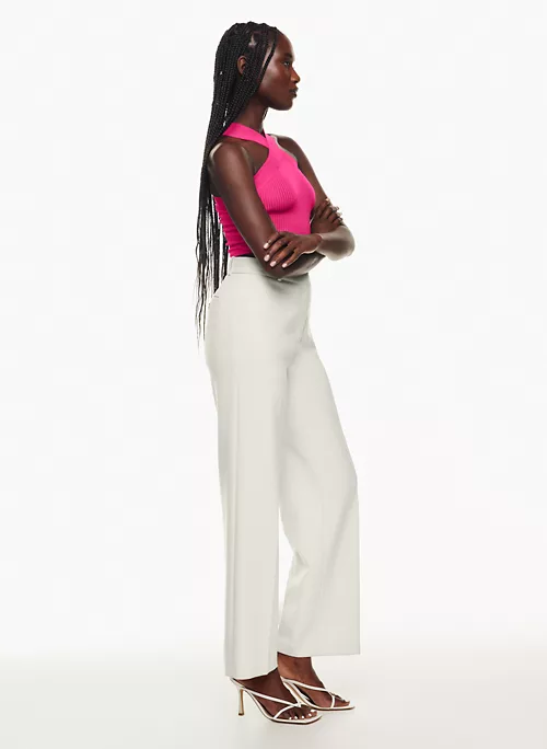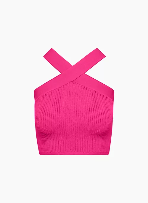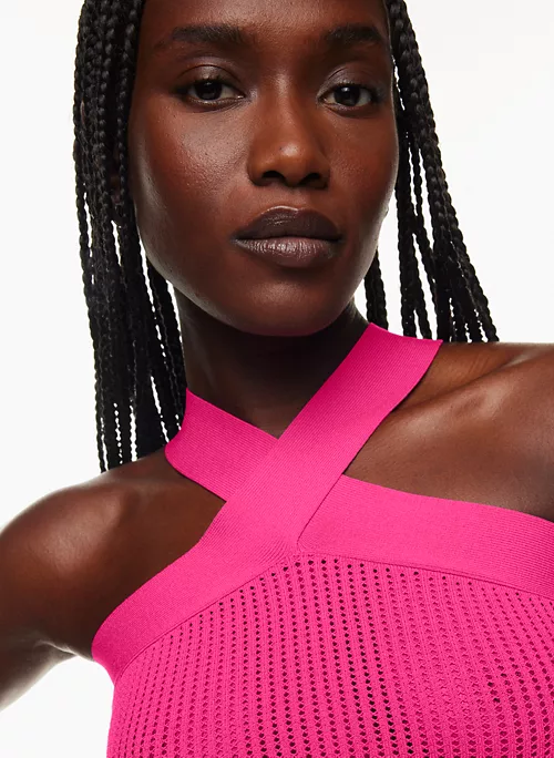 This is a fully fashioned tank with a criss-cross halter neckline. It’s made with Sculpt Knit — Babaton’s signature figure-smoothing yarn. The perfect amount of stretch hugs in the right places to shape and sculpt your form. It’s constructed using a Ladder Rib stitch with a vertical ribbed pattern for a textural look and airy feel.