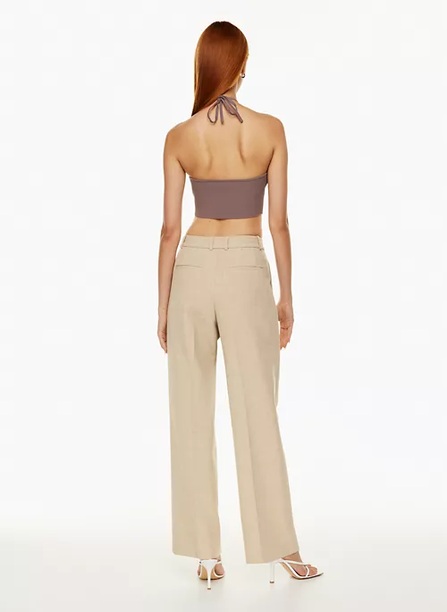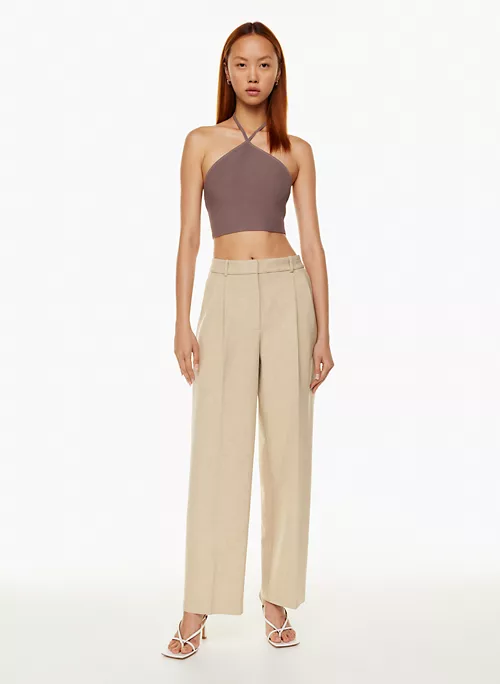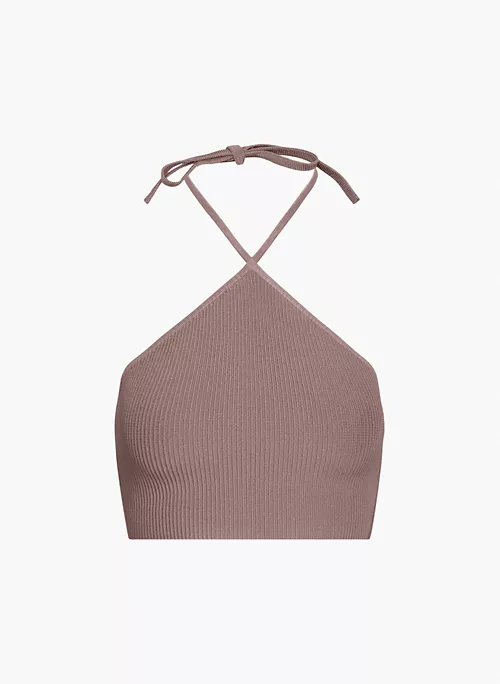 This is a cropped halter top with fully fashioned construction and straps that tie at the back. It’s made with Sculpt Knit — Babaton’s signature figure-smoothing yarn. The perfect amount of stretch hugs in the right places to shape and sculpt your form. It’s constructed using an Ottoman stitch with close distinct ribs for a structured and textural feel.