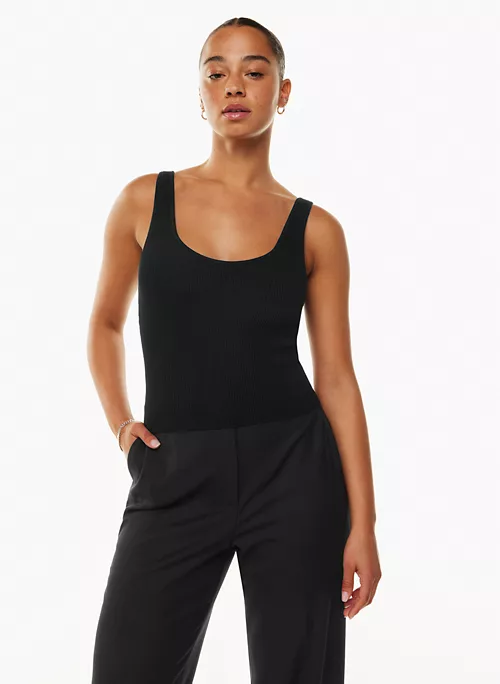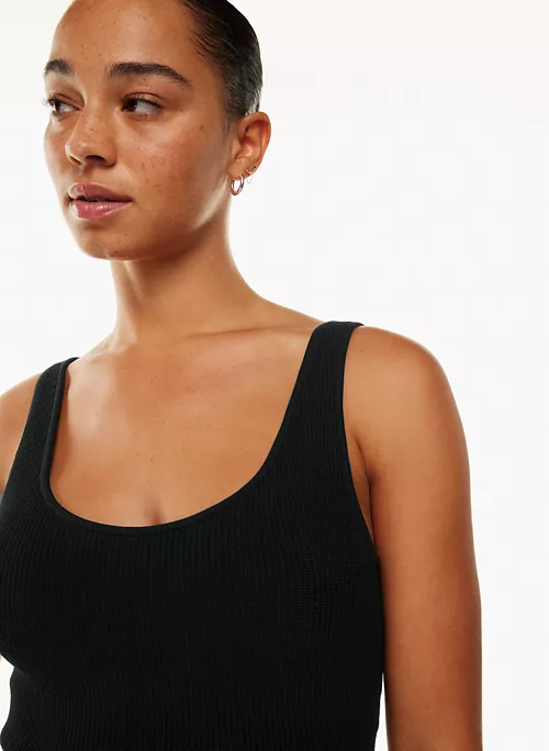 This is a scoop-neck tank with fully fashioned construction. It’s made with Sculpt Knit — Babaton’s signature figure-smoothing yarn. The perfect amount of stretch hugs in the right places to shape and sculpt your form. It’s constructed using an Ottoman stitch with close distinct ribs for a structured and textural feel.Â