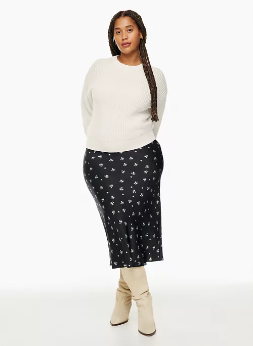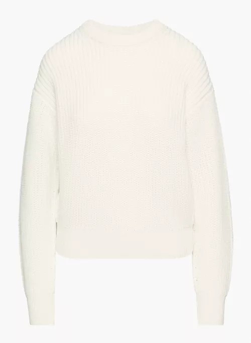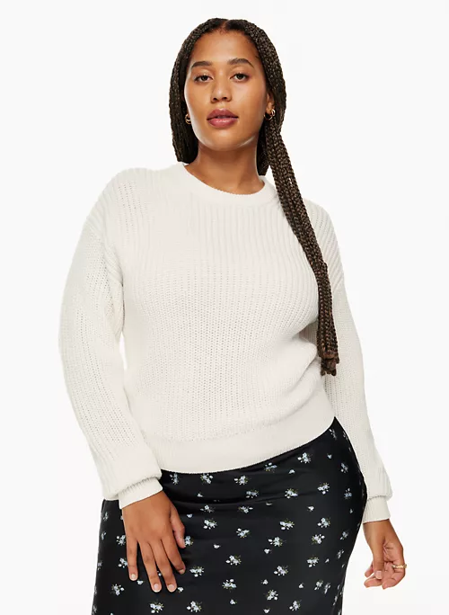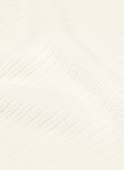 This is a crew-neck sweater with dropped shoulders and fully fashioned construction. It’s knit with Embrace Merino™ — extra-fine 100% merino wool yarn coveted for its natural warmth and super soft feel. We source ours from a premier Italian mill. It’s constructed using a Half Cardigan stitch with distinct vertical ribs for a three-dimensional look and feel.