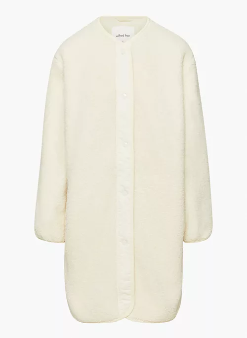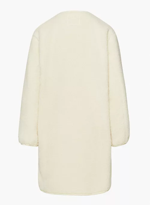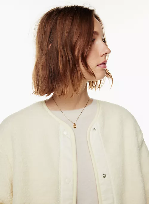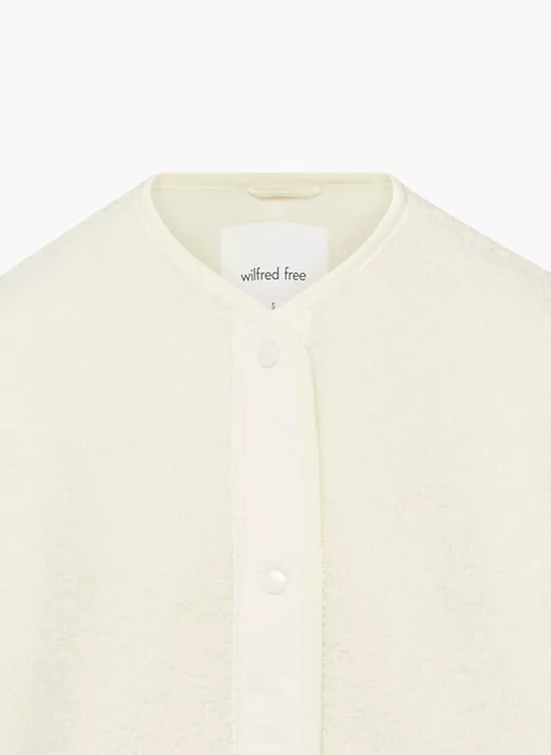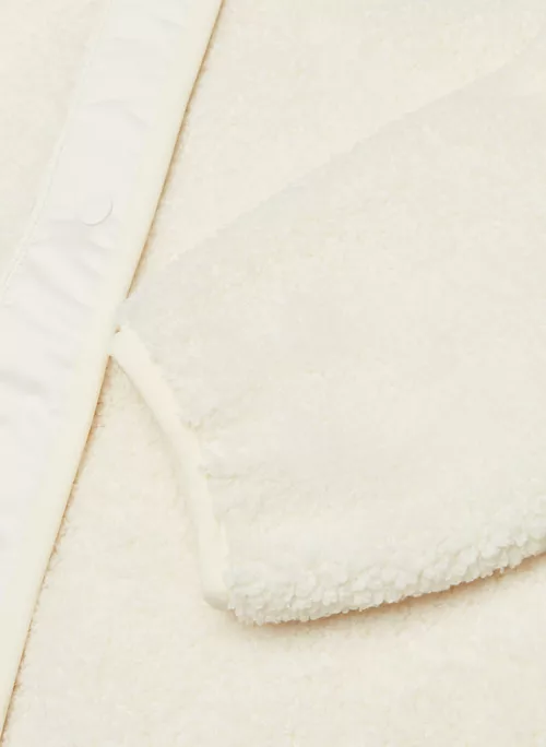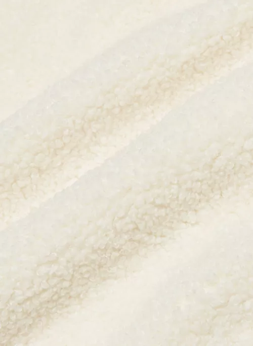 This is a cozy crew-neck jacket with snap closures, inseam pockets and dropped shoulders. It’s made from plush, textural sherpa fabric.