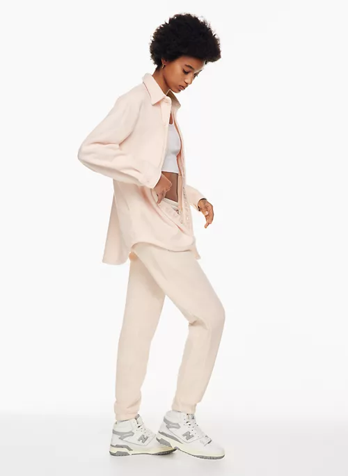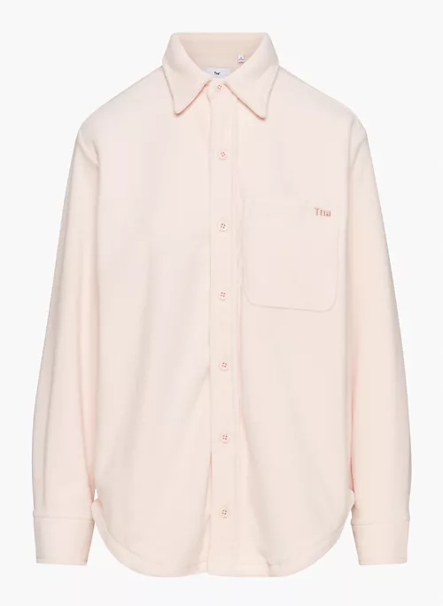 This is a collared button-up shirt with a front patch pocket and rounded hem. It’s made with Sno Polar — lightweight, 100% recycled micro fleece made with Polartec© 200 that’s breathable and warm with a velour-like feel.