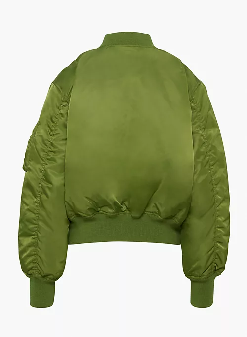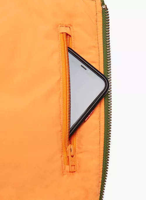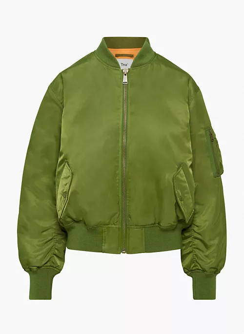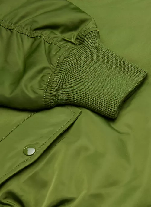Engineered to deliver warmth to 0°C / 32° F, this is a bomber jacket with a relaxed silhouette and ribbed trim. It’s filled with 100% responsibly sourced, 700+ fill-power goose down that provides ultra-warm, lightweight insulation. It’s constructed with Nylo Tech — water-repellent twill fabric with a light, glossy sheen.