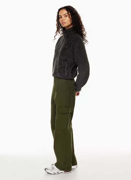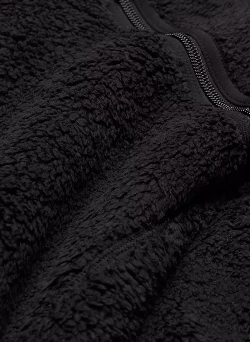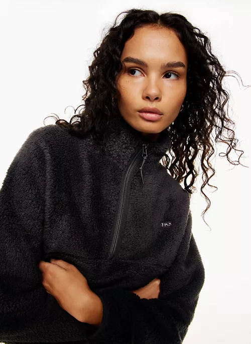 This is a half-zip mock-neck pullover with dropped shoulders and zippered hand pockets. It’s made with Teddybear Polar — warm, cozy 100% recycled fleece with a teddy-soft texture.
