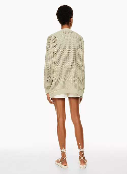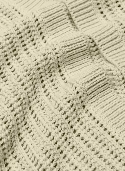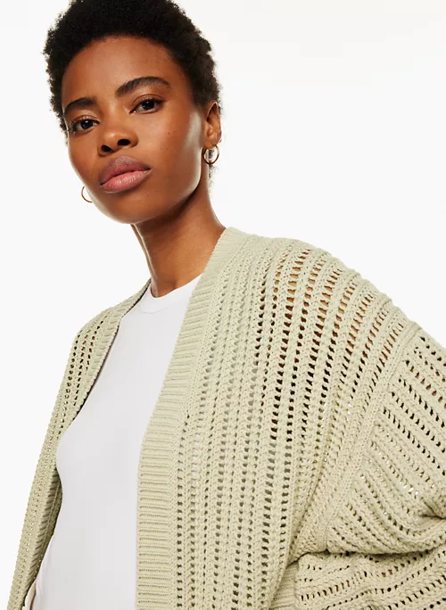This is a relaxed cardigan with an open front and ribbed trim. It’s knit with soft cotton yarn. It’s constructed using a Mesh stitch with an open knit pattern for an airy feel.