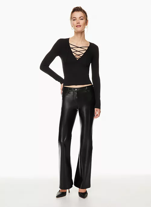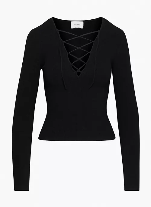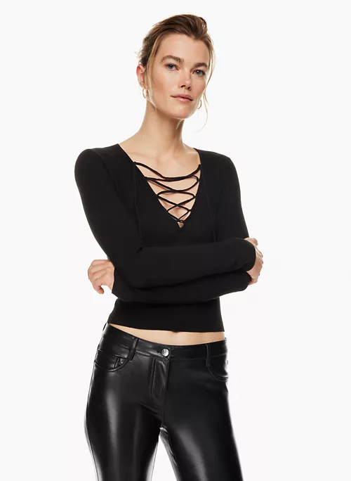 This is a lace-up sweater with fully fashioned construction. It’s knit with Wonder Yarn — the lightweight yarn that lives up to its name. This peachy-soft yarn offers the all-season warmth of wool, without the wool. It’s made with LENZINGâ„¢ ECOVEROâ„¢ Viscose — responsibly sourced wood-based fibres produced through a process that reduces impact on forests, biodiversity and water supply. This version is constructed using a Half Cardigan stitch with distinct vertical ribs for a three-dimensional look and feel.