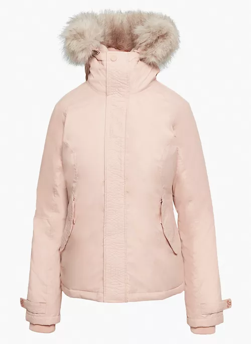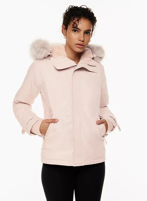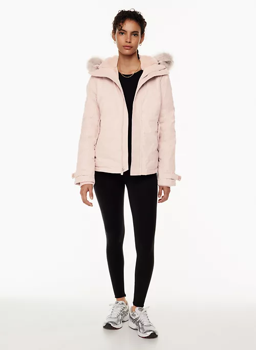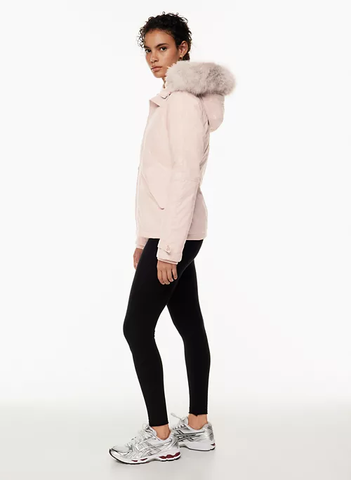 Engineered to deliver warmth down to -20°C / -4°F, this is a hooded goose down parka with a slim fit and hidden zipper. It has a removable Real Faux Fur-trimmed hood and merino wool cuffs for extra coziness. It’s made from Arctic Twill — waterproof and windproof twill fabric with a soft sueded face and a peachy feel.
