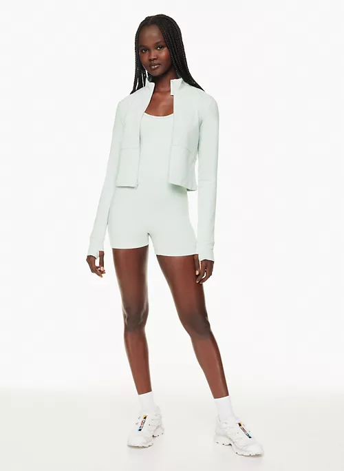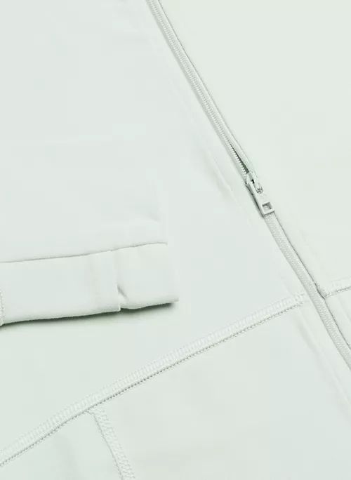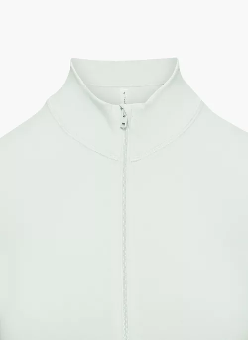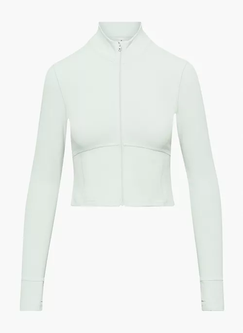 This is a zip-up jacket with a mock neckline and thumbholes. It’s made with TnaLIFE™ — a versatile, body-hugging fabric that’s sweat wicking and cottony soft.