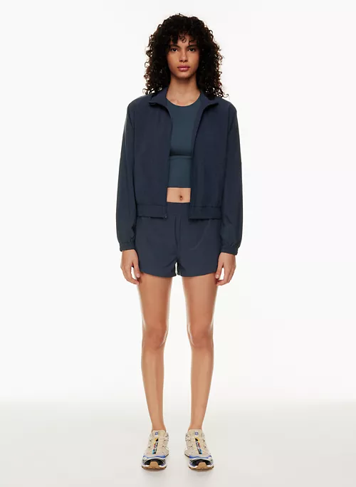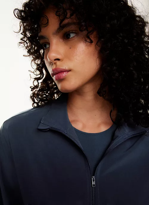 This is a relaxed-fitting zip-up jacket with hand pockets and elastic cuffs. It’s made from TnaMOVE™ — a sweat-wicking fabric with a cool feel that’s made with recycled materials.