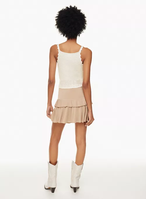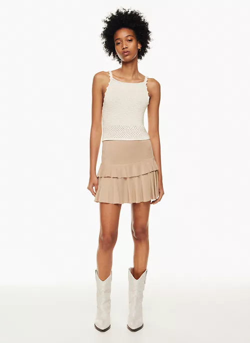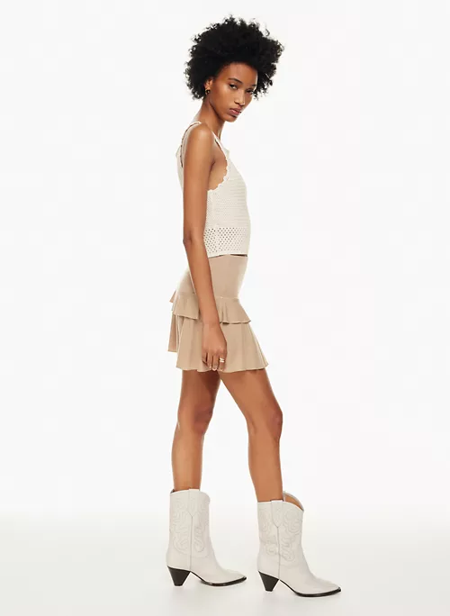 This is a tiered micro skirt with an elastic waistband and ruffled hem. Itās made with Relux Jersey, an ultra-soft and drapey fabric that uses TENCEL⢠Lyocell ā responsibly sourced wood-based fibres produced through a closed-loop system that reduces environmental impact.