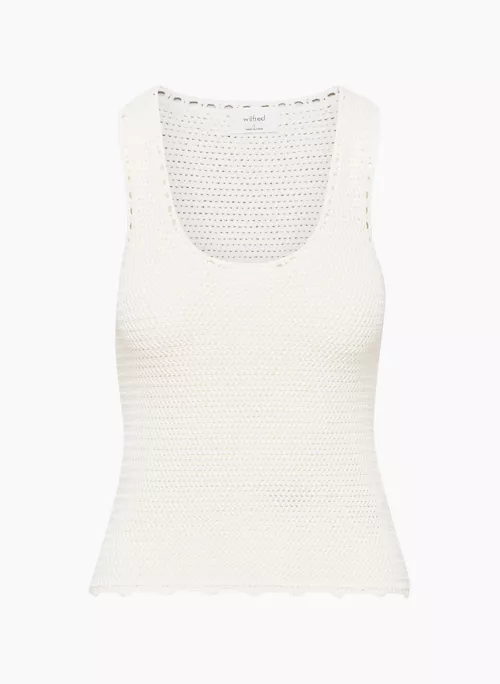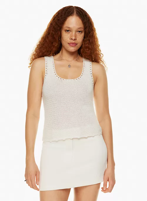This is a fully fashioned scoop-neck tank. It’s made with soft, midweight cotton yarn. Itβs constructed using a Crochet stitch with a looped knit pattern for a textural look and airy feel.
