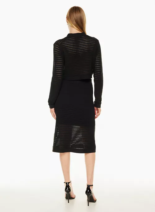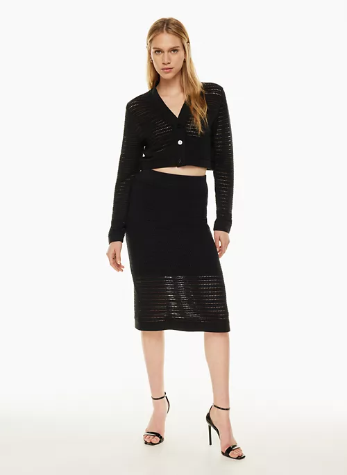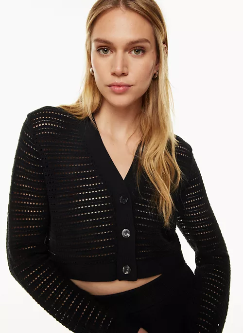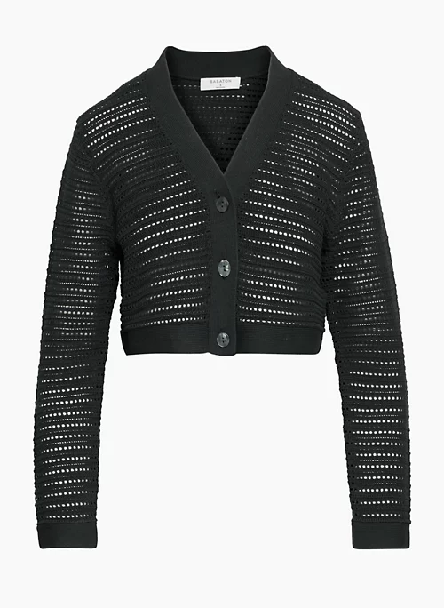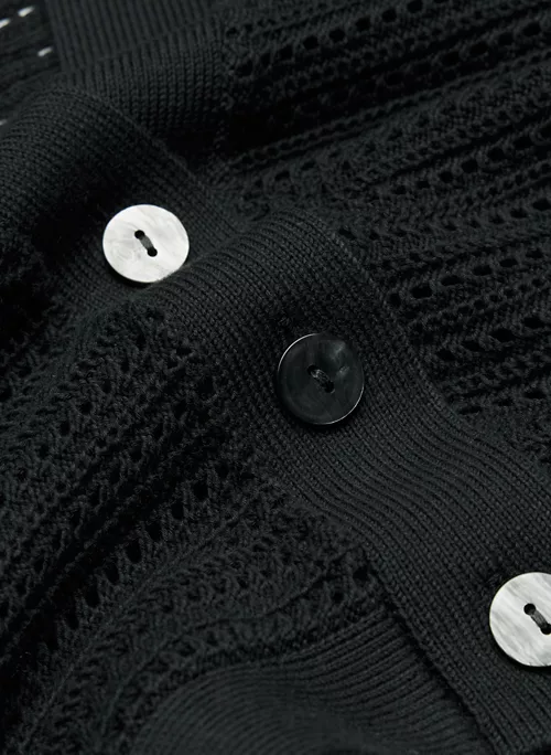 This is a V-neck cardigan with hand crochet details and a three-button closure. It’s knit with 100% organic cotton yarn. It’s constructed using a Crochet stitch with a looped knit pattern for a textural look and airy feel.